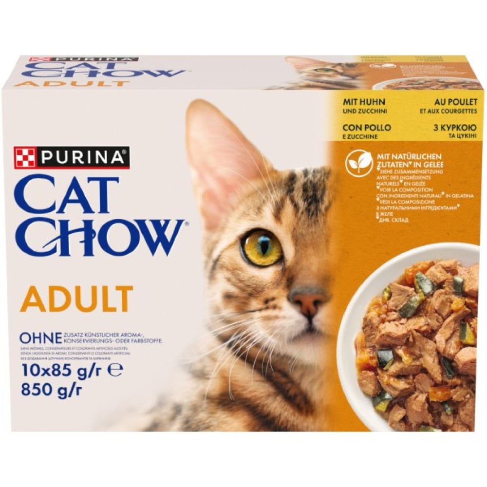 Вологий корм для кішок Purina Cat Chow Adult з куркою та цукіні в упаковці 85 г х 10 шт — це ідеальне рішення для вашого улюбленця. Розроблений досвідченими експертами з 1926 року, цей корм забезпечує вашому коту все необхідне для повноцінного та здорового життя. Ніжні шматочки у легкому желе містять високоякісні протеїни, що сприяють міцності та енергії вашого кота.