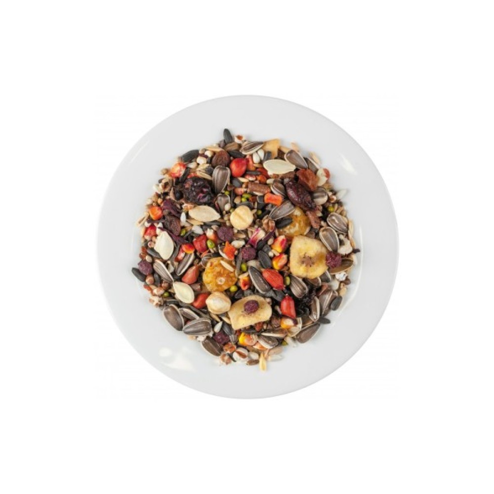 Склад овес голозерний, маїс, насіння соняшника чорного, насіння соняшника сірого, ячмінь, гречка, сафлор, сорго біле, арахіс, насіння конопель, маш, фрукти гранульовані, насіння гарбуза, рис неочищений, пшениця повітряна, глід, виноград сушений, бананові чіпси, фізаліс сушений, подрібнена ламінарія, насіння розторопші, кероб подрібнений, фундук, шипшина, гібіск, морква сушена, обліпиха сушена