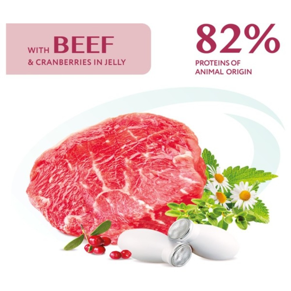 • Високий вміст яловичого м’яса забезпечує собак високоякісним легкозасвоюваним протеїном тваринного походження, що забезпечує незамінними амінокислотами та сприяє здоровому травленню.