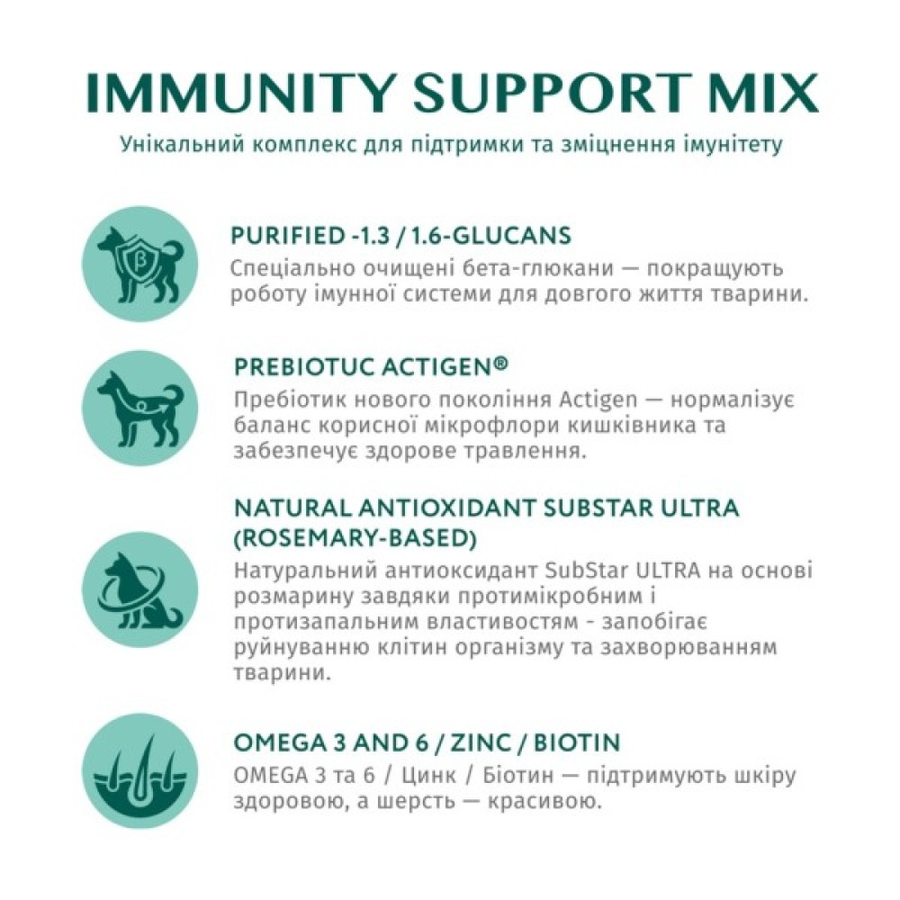 • OMEGA 3 і 6 / Цинк / Біотин – підтримують шкіру здоровою, а шерсть – красивою.