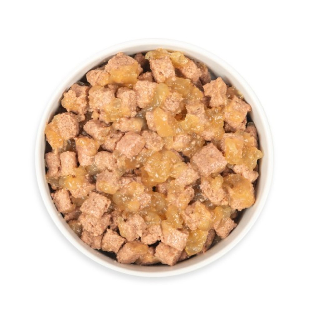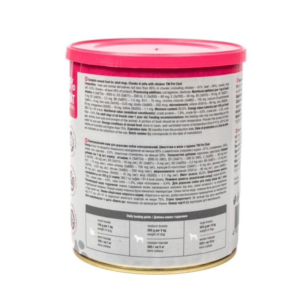 М’ясні шматочки в желе Pet Chef — це збалансований повнораціонний вологий корм для дорослих собак, який є чудовим вибором для тих, хто хоче забезпечити своїх улюбленців смачним та поживним раціоном. Кожен шматочок корму містить мінімум 85% м’ясних інгредієнтів, що задовольнить потреби тварини у білках та енергії, а також оптимальну комбінацію макро- і мікроелементів, вітамінів і амінокислот, необхідних для її розвитку та загального здоров’я. Желе підсилює апетитність, роблячи кожен шматочок надзвичайно соковитим і ароматним.
