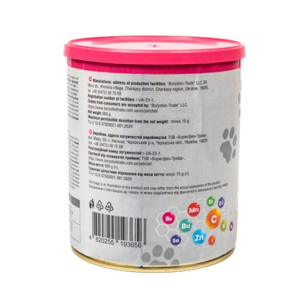 Поживна цінність (аналітичний склад): сирий протеїн – 7,8%, сирий жир – 4,0%, сира зола – 1,3%, сира клітковина – 0,4%. Вміст вологи: 82,0 %. Для дорослих собак усіх порід віком від 1 року.