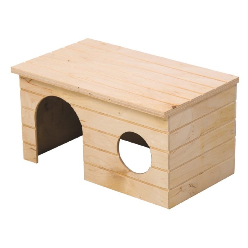 Зручний просторий будиночок виготовлений із міцної фанери та не містить металевих елементів, які можуть травмувати тварину. Укриття захищає від протягів і холоду, дає відчуття затишку та захищеності. Дверцята широкі, вікно забезпечує тварині огляд і покращує доступ повітря в будиночок.