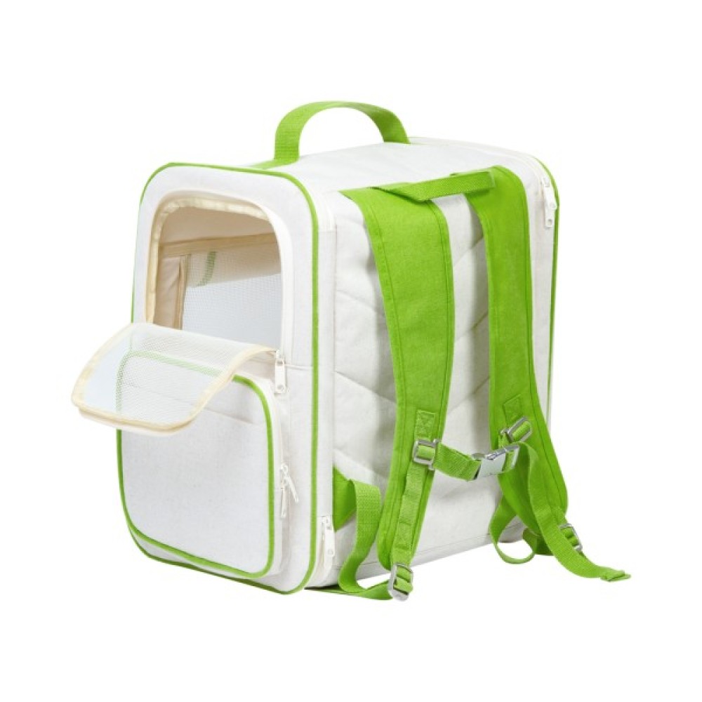 Рюкзак-переноска має міцне дно, вентиляційні сітки з чотирьох сторін, декілька варіантів відкривання, додаткову формовану підстилку, зручну кишеню для аксесуарів, а також карабін безпеки. Широкі комфортні лямки та додаткова фіксація на грудях знижують навантаження на спину людини, що дозволяє подорожувати з комфортом не тільки пухнастому улюбленцю, а і його господарю.
