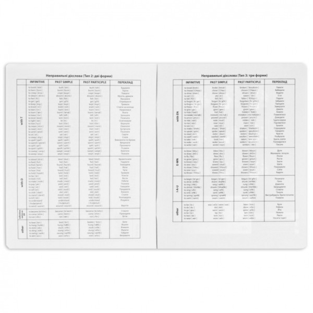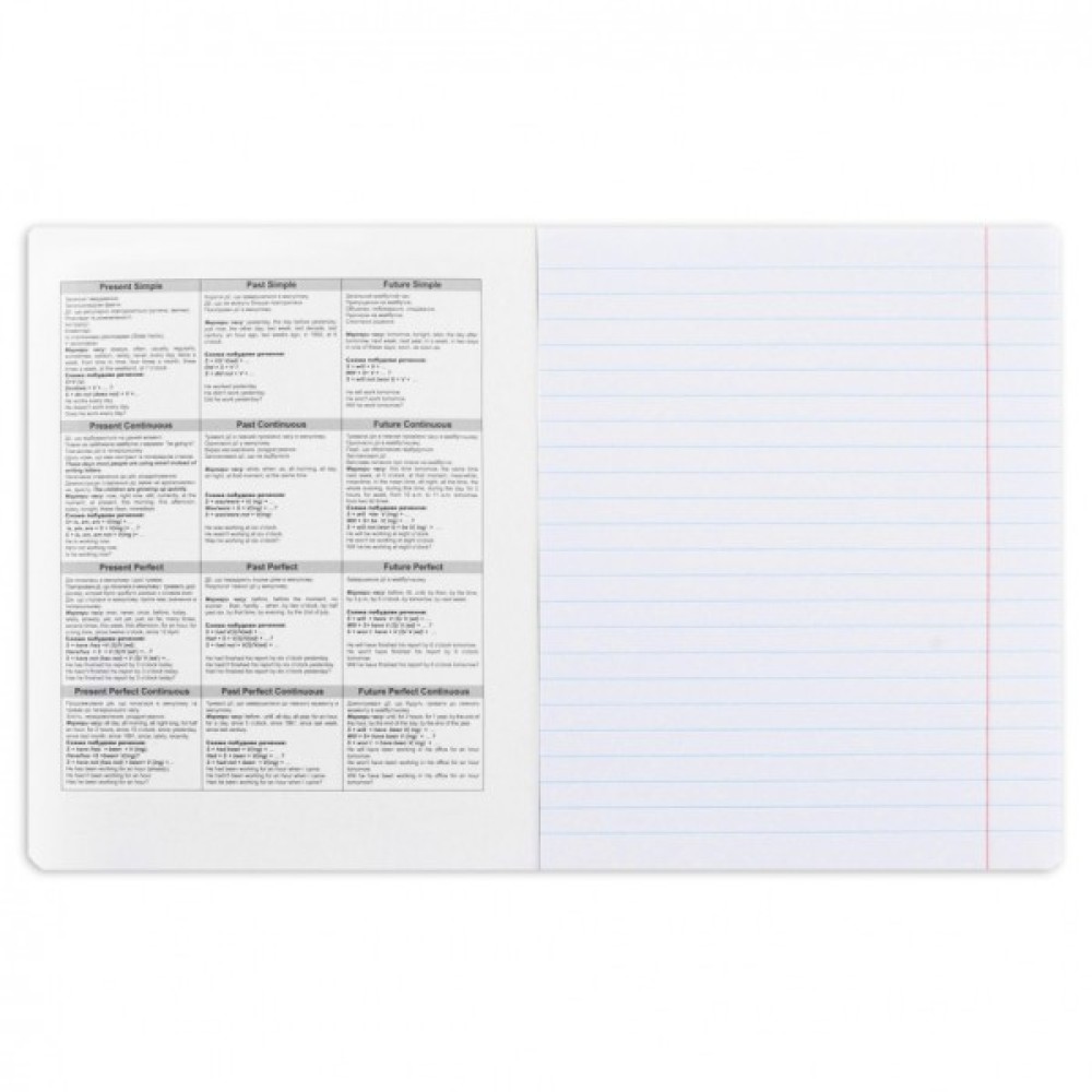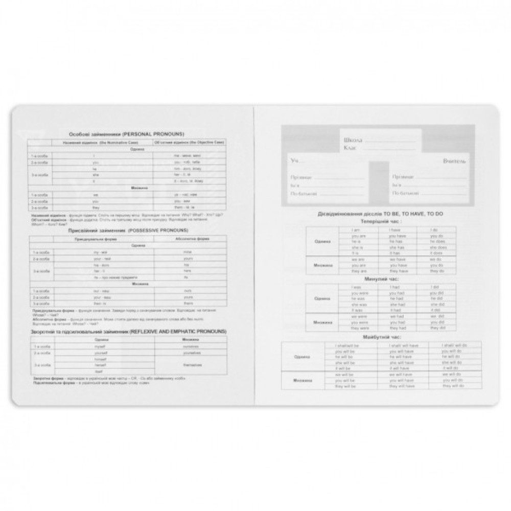 - У внутрішньому блоці на шести сторінках розміщено довідкову інформацію. Ця інформація включає основні правила англійської мови, такі як граматичні конструкції, часи дієслів, неправильні дієслова та інші важливі відомості, які допомагають учням у вивченні предмета.Таким чином, предметний зошит з геометрії є корисним посібником для школярів, надаючи необхідну інформацію безпосередньо у навчальному процесі;
