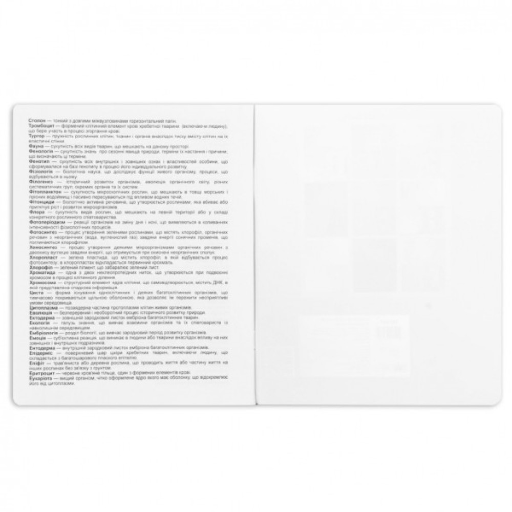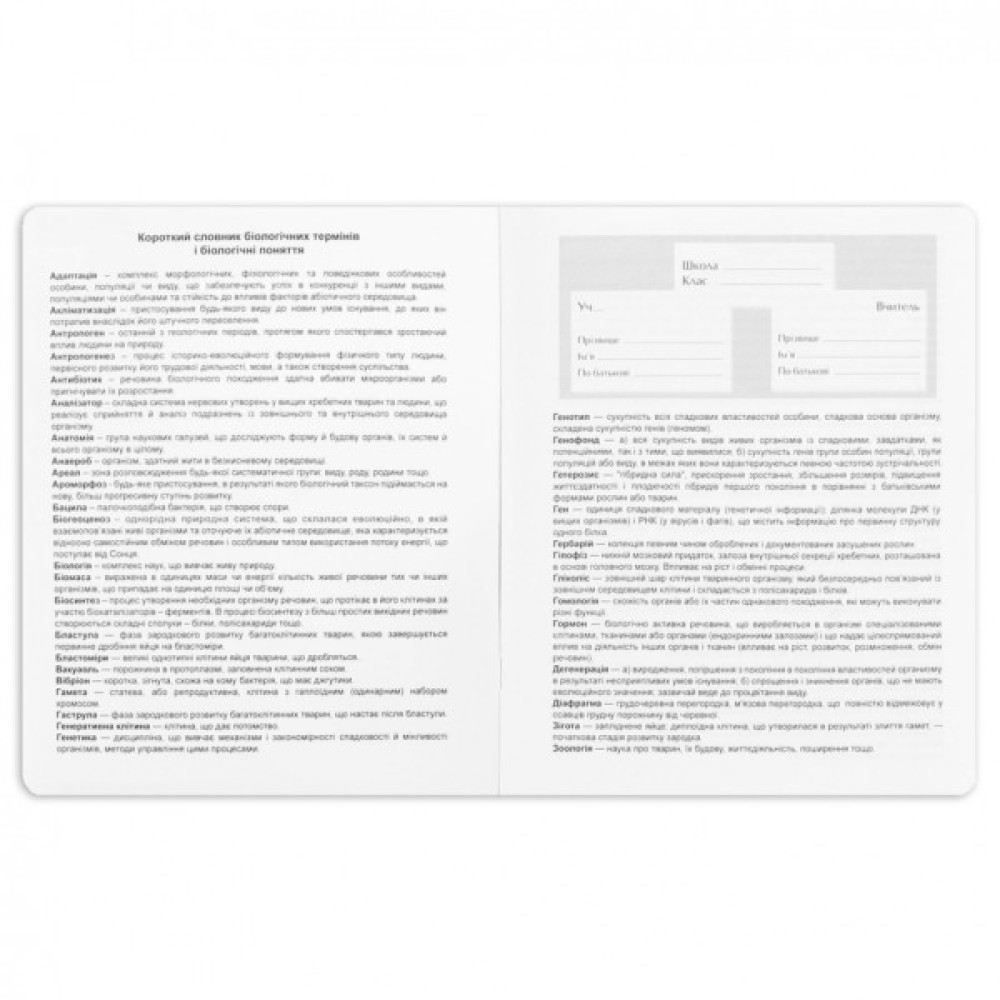 - У внутрішньому блоці на шести сторінках розміщено довідкову інформацію. Ця інформація включає короткий словник біологічних термінів та біологічних понять. Таким чином, предметний зошит з біології є корисним посібником для школярів, надаючи необхідну інформацію безпосередньо у навчальному процесі;