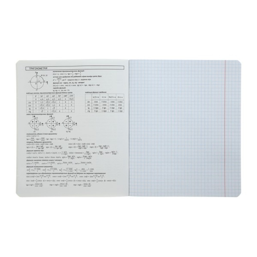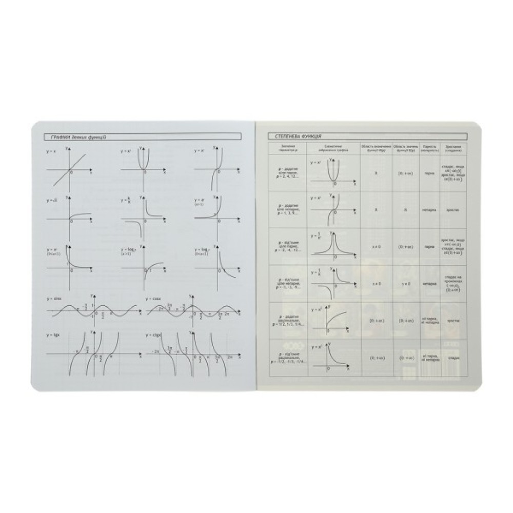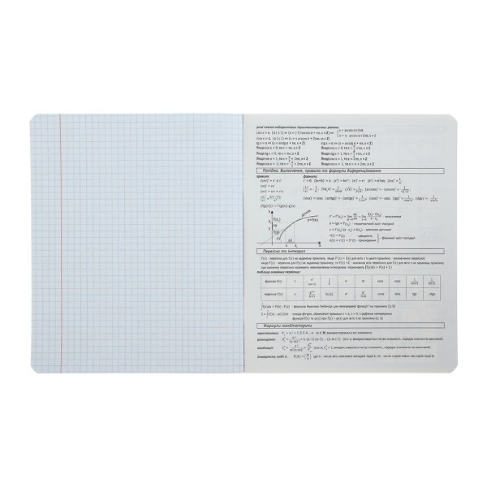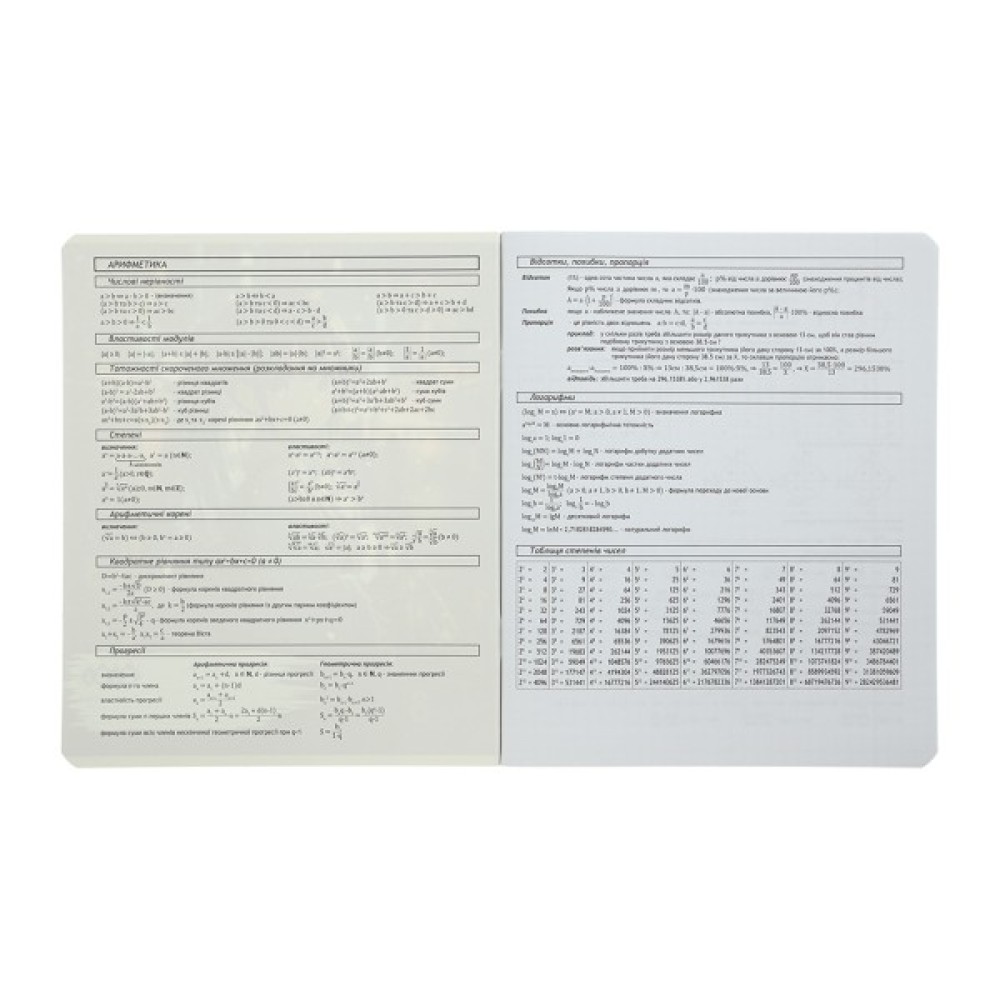 - на внутрішньому боці обкладинки, а також на першому та останньому додатковому аркуші, розміщено довідкову інформацію з предмета (загалом 6 сторінок формул, визначень, понять і правил з предмета).