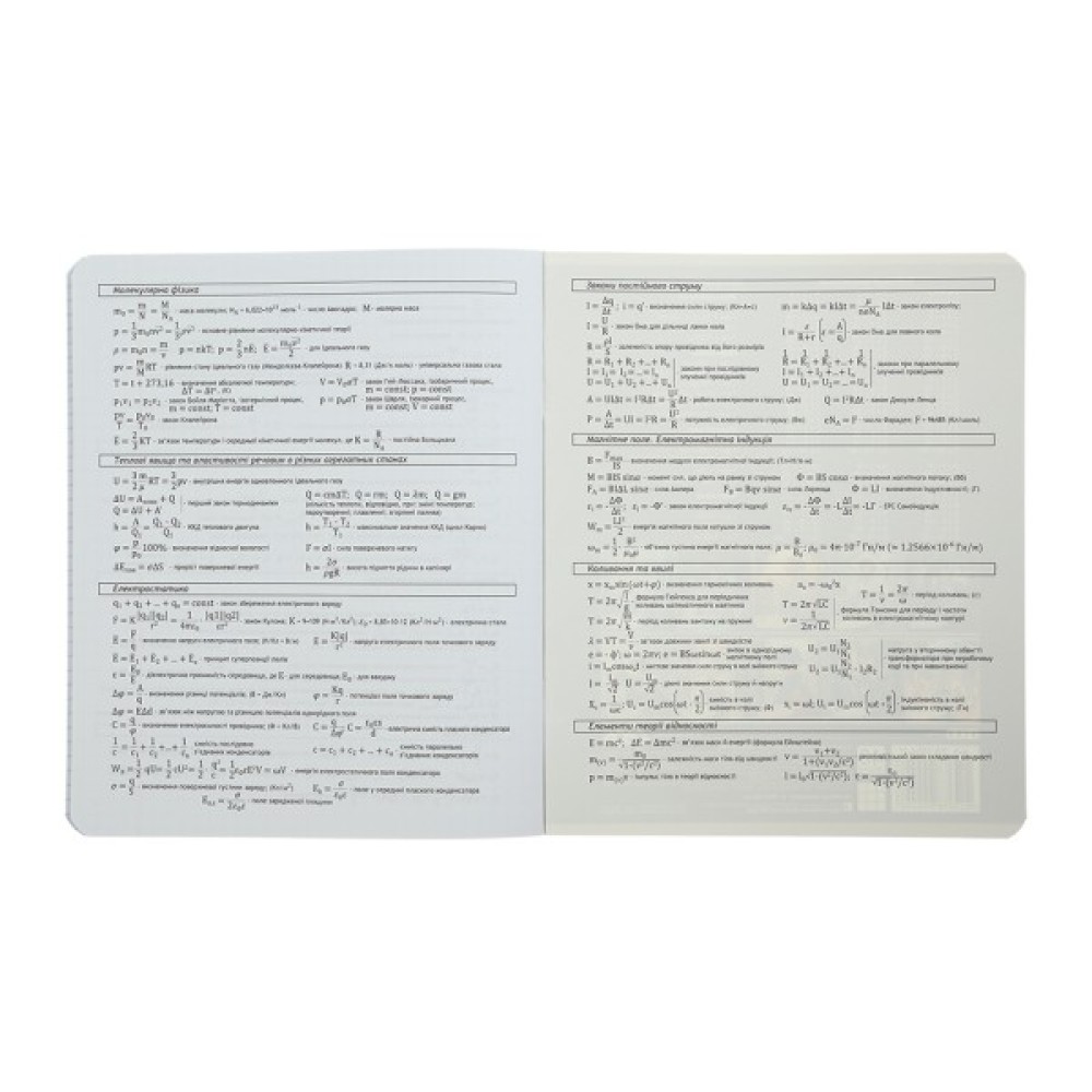 - на внутрішньому боці обкладинки, а також на першому та останньому додатковому аркуші, розміщено довідкову інформацію з предмета (загалом 6 сторінок формул, визначень, понять і правил з предмета).