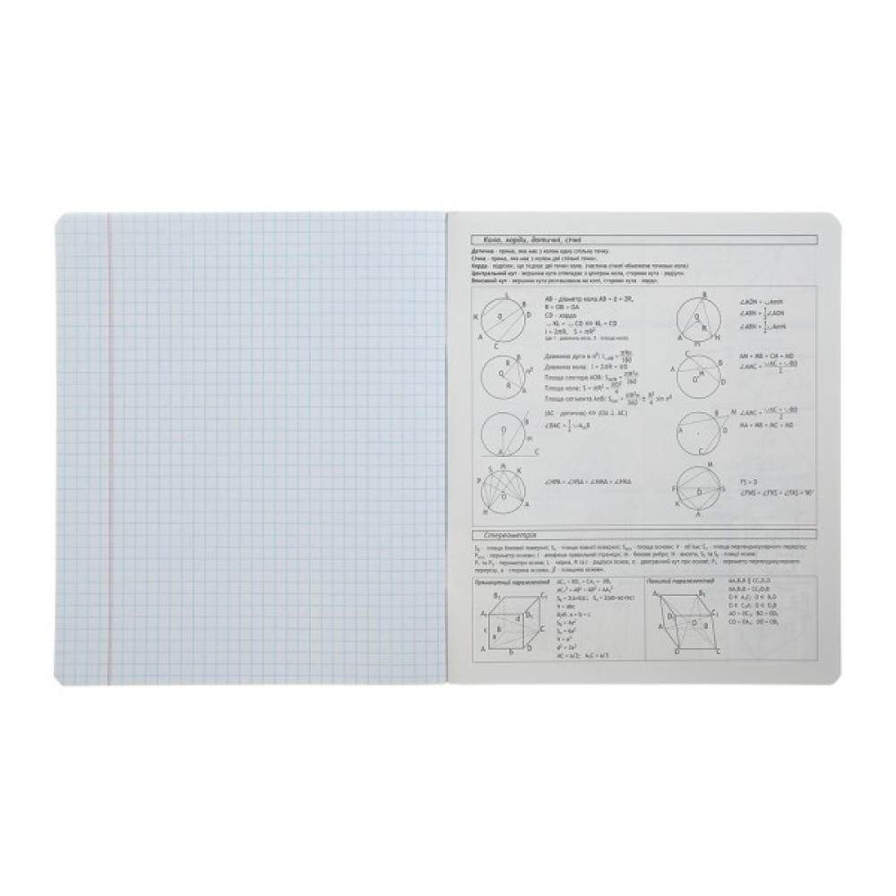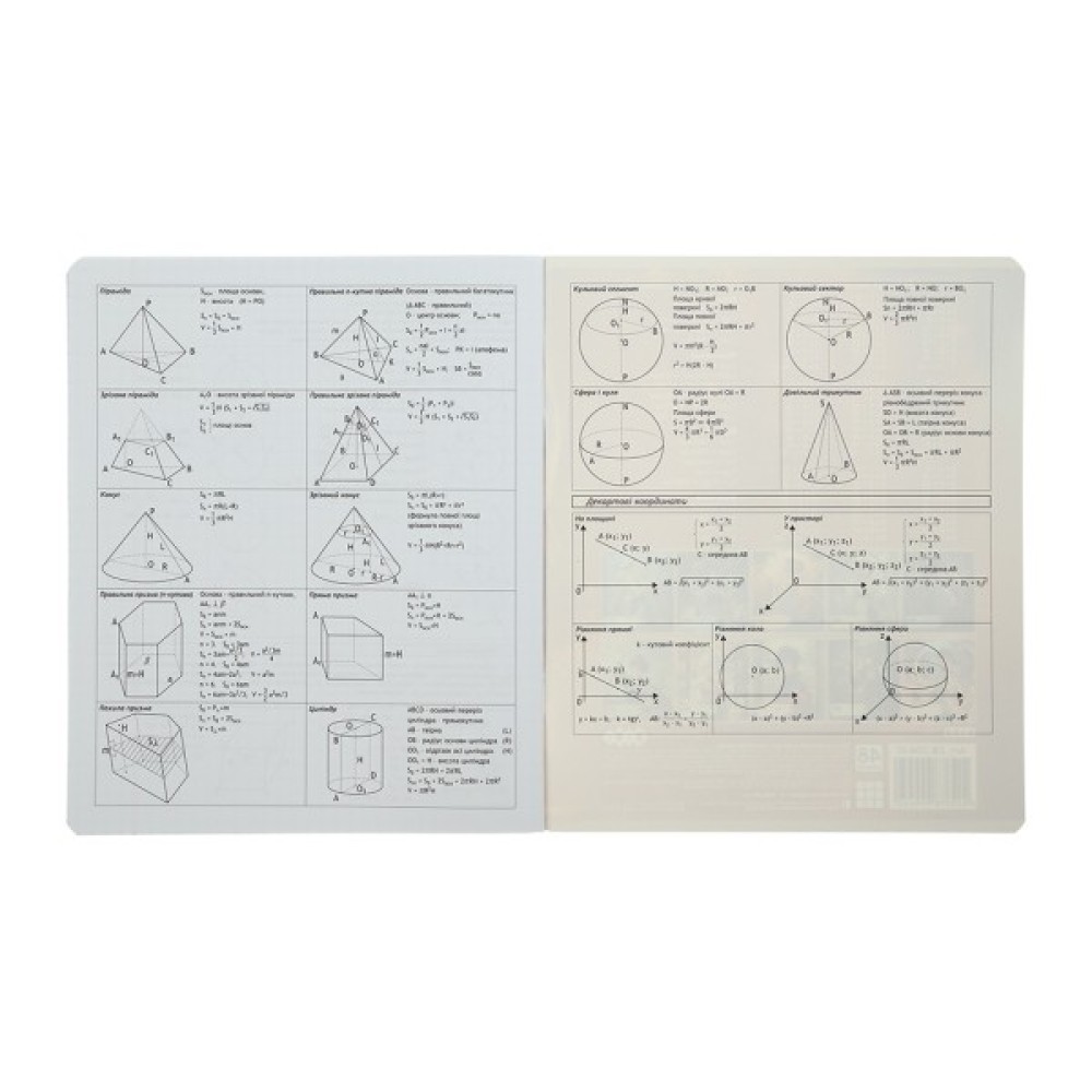 - на внутрішньому боці обкладинки, а також на першому та останньому додатковому аркуші, розміщено довідкову інформацію з предмета (загалом 6 сторінок формул, визначень, понять і правил з предмета).