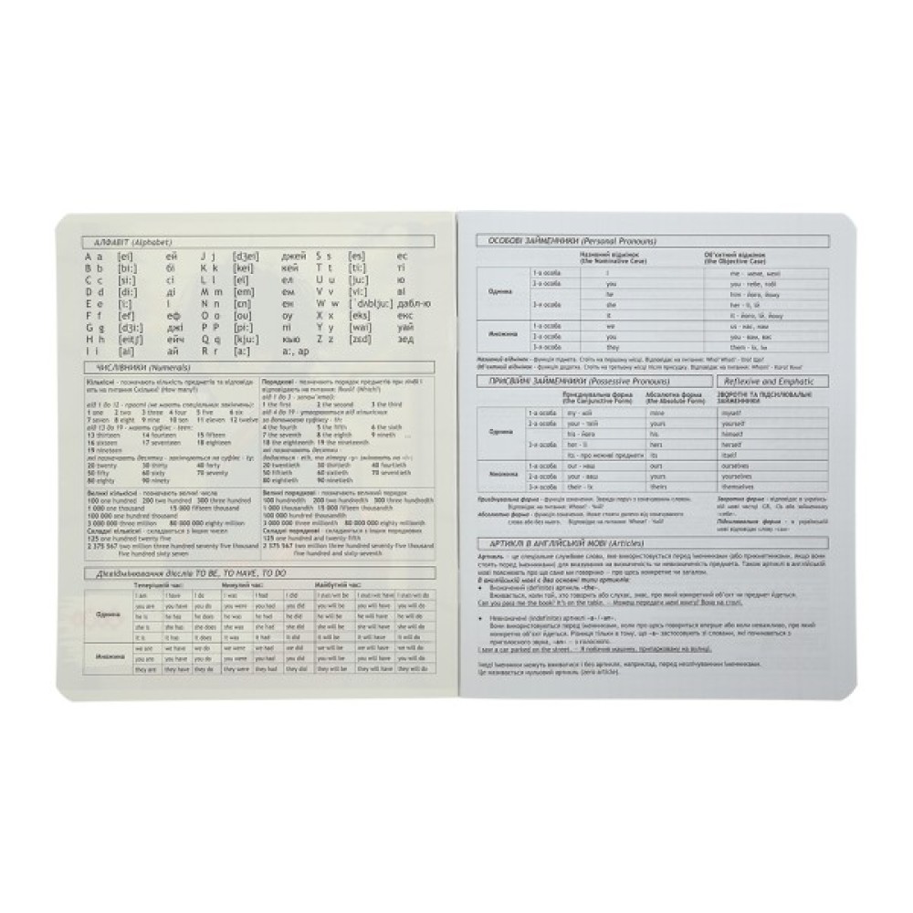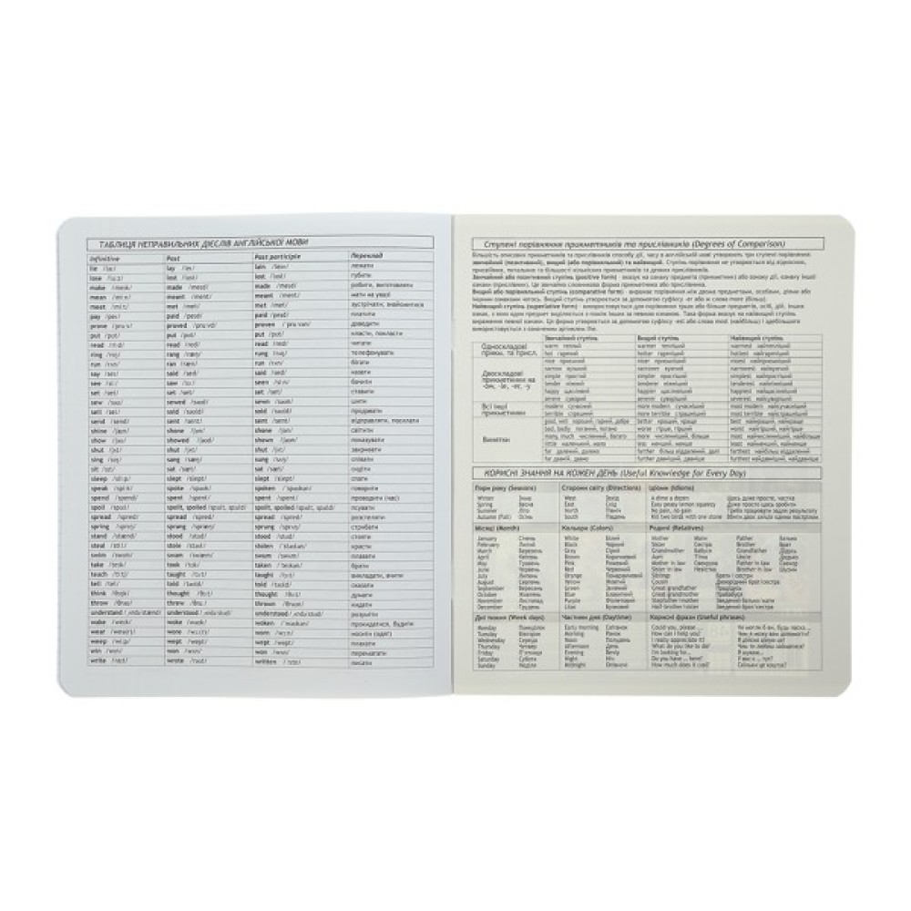 - на внутрішньому боці обкладинки, а також на першому та останньому додатковому аркуші, розміщено довідкову інформацію з предмета (загалом 6 сторінок визначень, понять і правил з предмета).