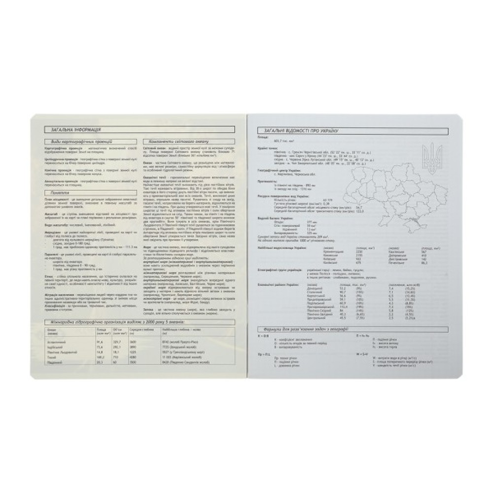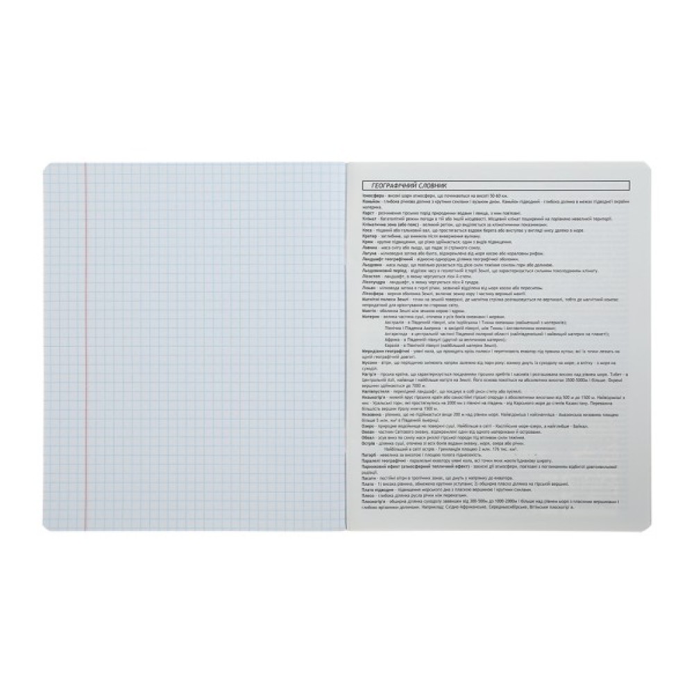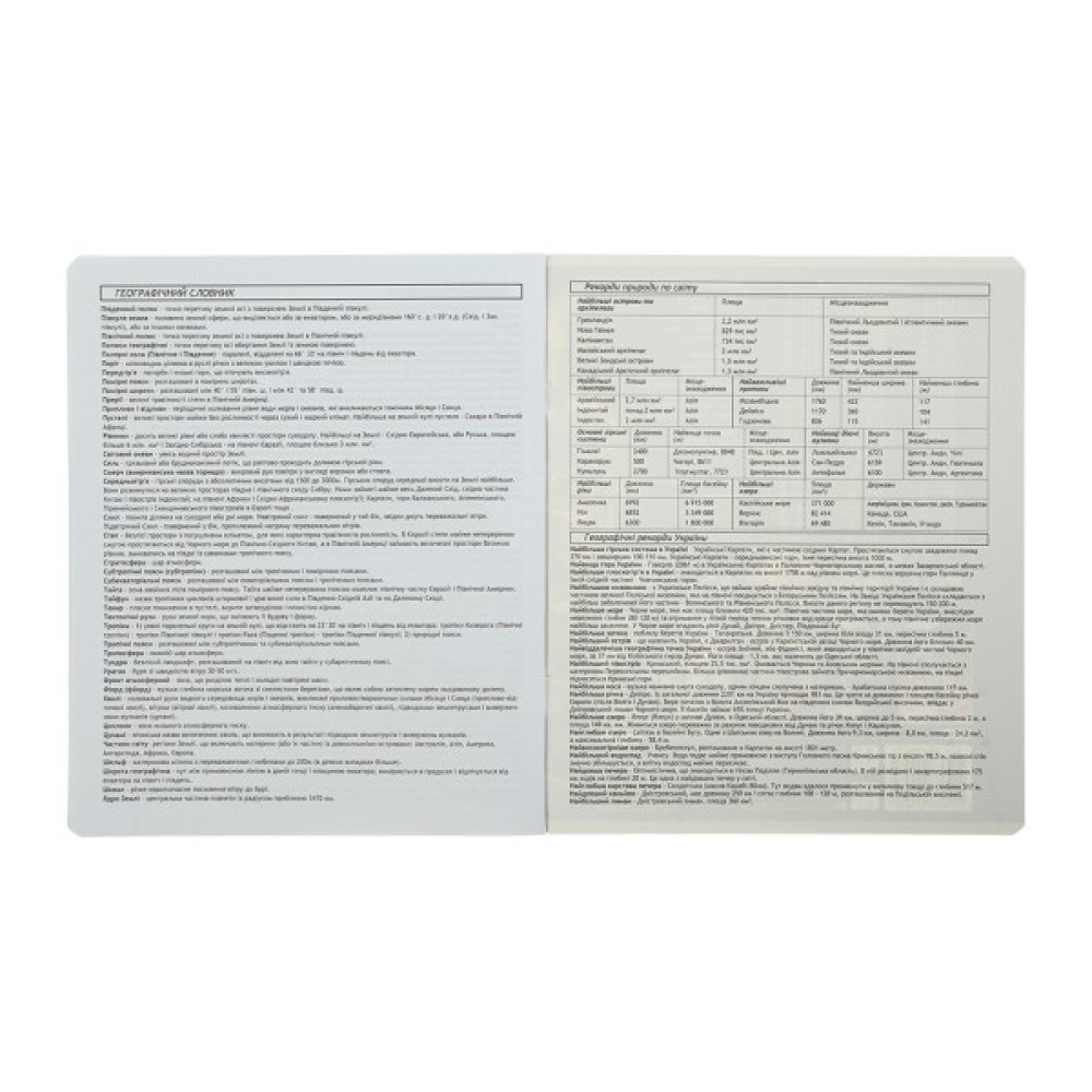- на внутрішньому боці обкладинки, а також на першому та останньому додатковому аркуші, розміщено довідкову інформацію з предмета (загалом 6 сторінок визначень, понять і правил з предмета).