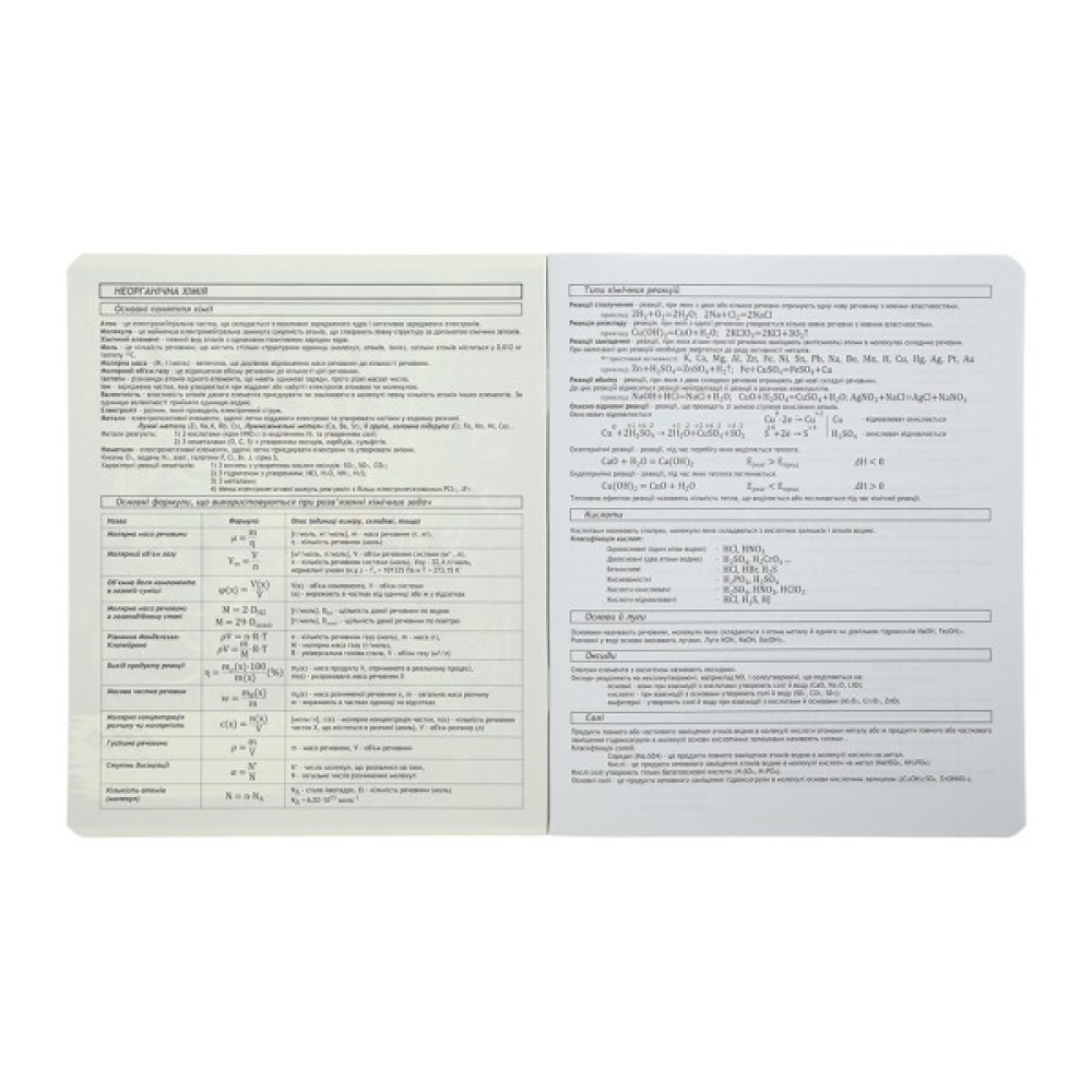- на внутрішньому боці обкладинки, а також на першому та останньому додатковому аркуші, розміщено довідкову інформацію з предмета (загалом 6 сторінок формул, визначень, понять і правил з предмета).