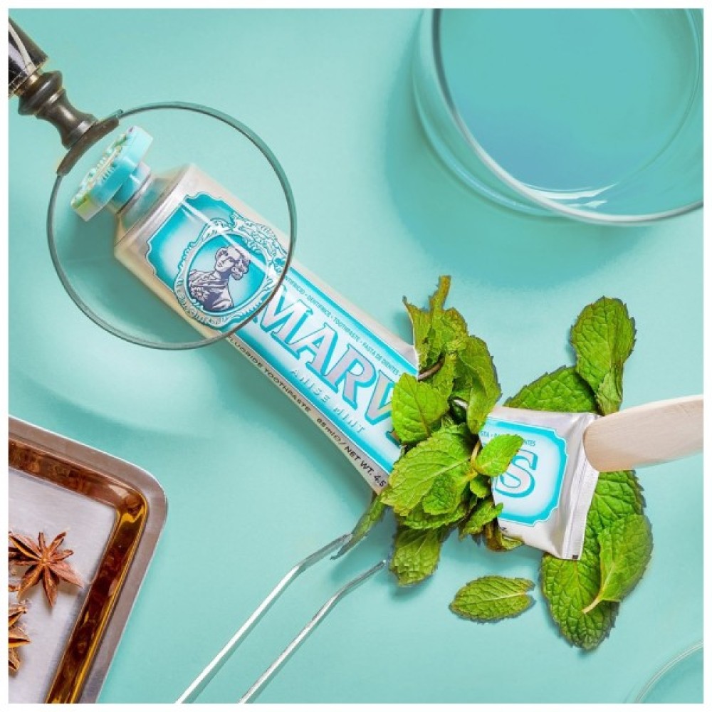 Поєднання гострих нот анісу та крижаної м'яти створює тривале відчуття свіжості. Вміст ксилітолу запобігає утворенню зубного нальоту і зміцнює зовнішній шар зубів. Вибір зубної пасти Marvis — це гарантія максимального догляду і захисту ваших зубів.