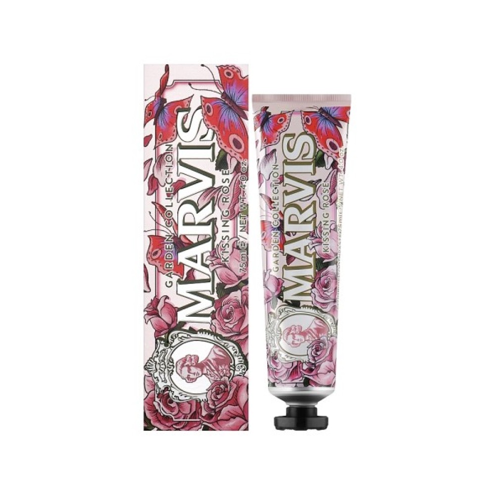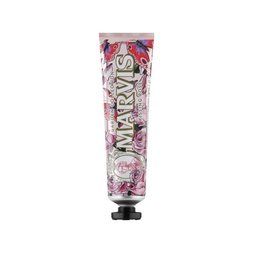 Зубна паста Marvis Garden Collection "Поцілунок троянди" об’ємом 75 мл – це вишукана композиція аромату, створена у співпраці з провідними парфумерними майстрами, яка робить щоденний догляд справжньою насолодою. Професійна якість пасти забезпечує надійну профілактику карієсу та ефективно перешкоджає утворенню зубного нальоту.