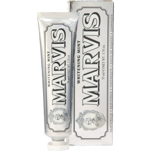 Зубна паста Marvis Відбілююча м'ята 85 мл забезпечує не лише сяючу посмішку, але й свіже дихання. Унікальна формула, збагачена інгредієнтами, такими як ксилітол, ефективно усуває плями від тютюну, кави та вина. Гліцерин та гідратована кремнезема забезпечують делікатне очищення, зберігаючи емаль здоровою.