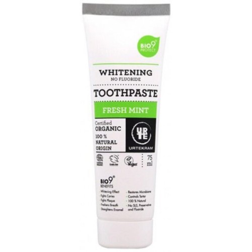 Зубна паста Urtekram органічна Свіжа м'ята об'ємом 75 мл (83609) створена для захисту чутливих зубів та забезпечення комплексного догляду. Завдяки природним інгредієнтам, таким як карбонат кальцію, гліцерин і екстракт алое вера, вона надає зубам природного блиску та здоров'я. Особлива формула містить органічні ефірні олії м'яти, які дарують свіжість і відчуття чистоти. Відсутність SLS/SLES підкреслює її ніжність та безпечність. Підходить для використання дітьми від 6 років і вагітними. Оберіть найкраще з природи для вашої усмішки з зубною пастою Urtekram.