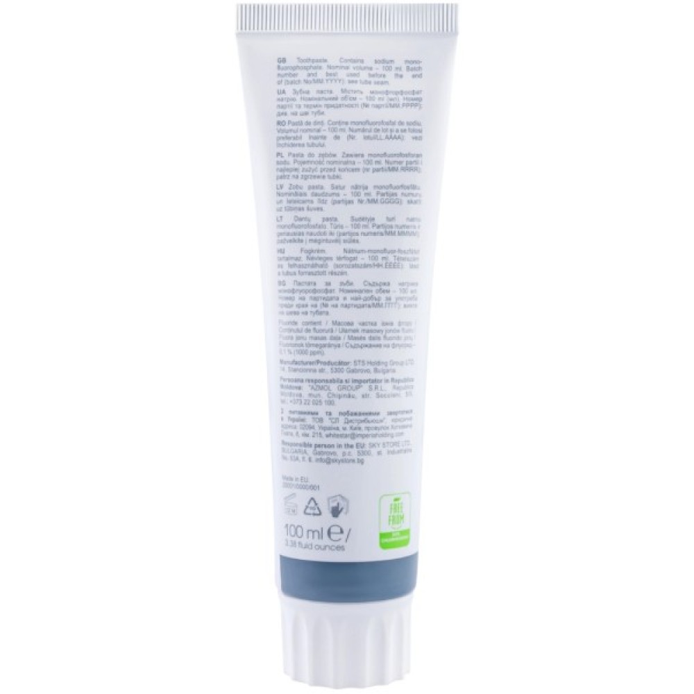 Aqua, Hydrogenated Starch Hydrolysate, Hydrated Silica, Dicalcium Phosphate Dihydrate, Potassium Nitrate, PEG-8, Calcium Pyrophosphate, Pentasodium Triphosphate, Aroma, Sodium Coco-Sulfate, Cellulose Gum, Sodium Monofluorophosphate, CI 77891, Sodium Lauroyl Sarcosinate, PVP, Sodium Methylparaben, Sodium Saccharin, Menthol, Papain, Mannitol, Limonene. Fluoride content – 0,1 % (1000 ppm)