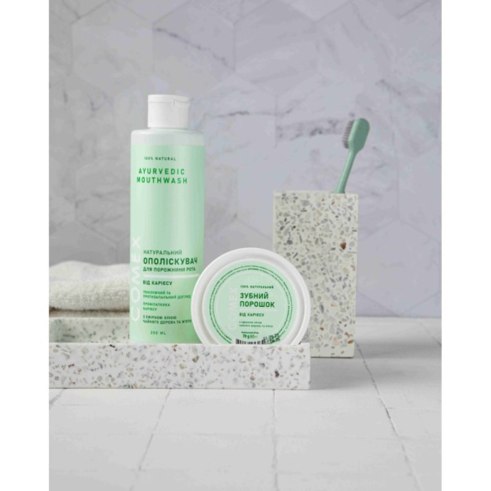 Повністю натуральний засіб для чищення зубів та профілактики карієсу. Ефірні олії чайного дерева та м’яти запобігають утворенню карієсу, зміцнюють зубну емаль, попереджають запалення ясен, освіжають подих, мають антибактеріальні властивості.