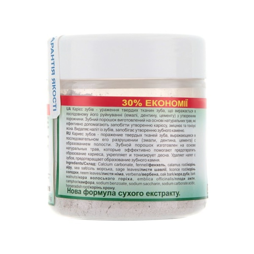 Діє засіб дуже делікатно, не пошкоджуючи емалі зубів. Така ефективна дія продукту можлива завдяки унікальному поєднанню кальцію й рослинних екстрактів. Їхня частка в складі становить не менше 21%. Зубний порошок ідеально підходить для використання всіма членами сім’ї. Засіб не є лікарським. Ваша усмішка за умови регулярного використання такого порошку сяятиме білизною.