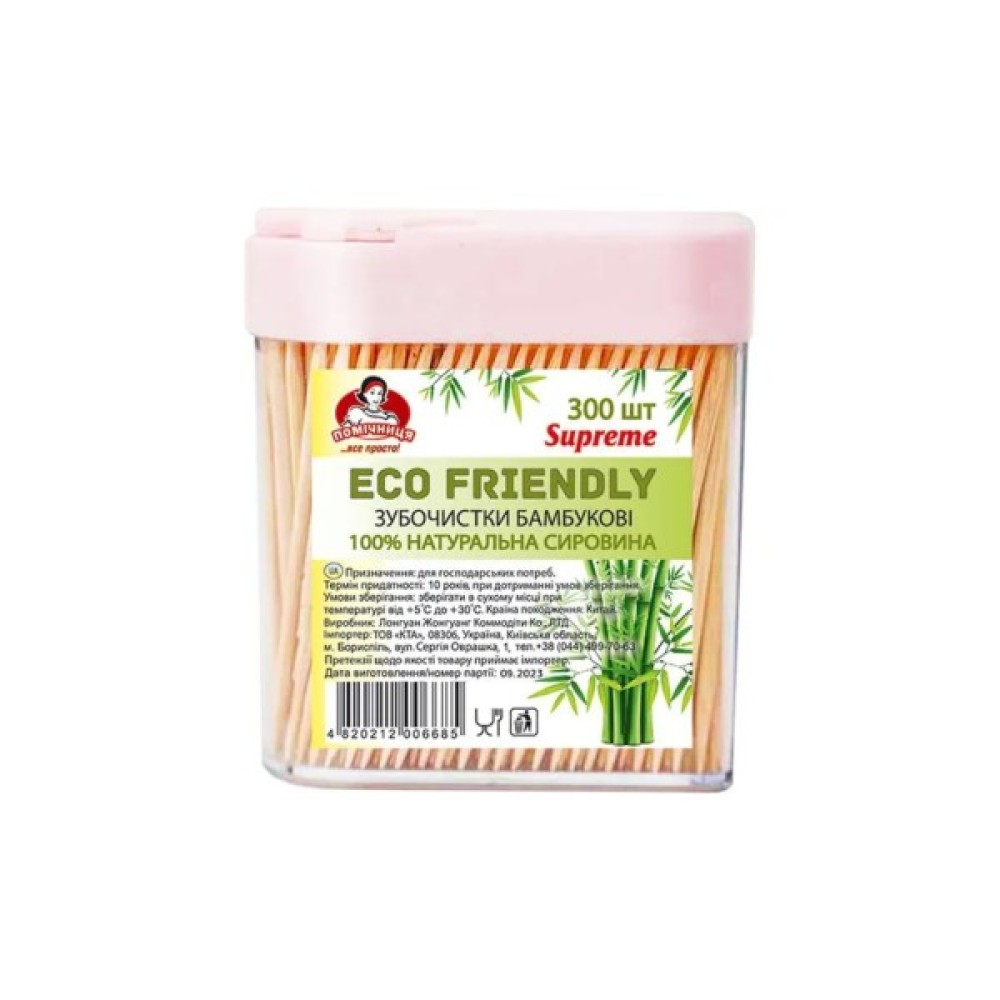 Зубочистки бамбукові Помічниця - загострена паличка бамбуку. Зубочистки призначені для видалення рештків їжі, що застрягли між зубами, також можуть використовуватись для нанизування дрібних наїдків (маслин чи шматочків сиру у канапках, лимону у коктейлях).