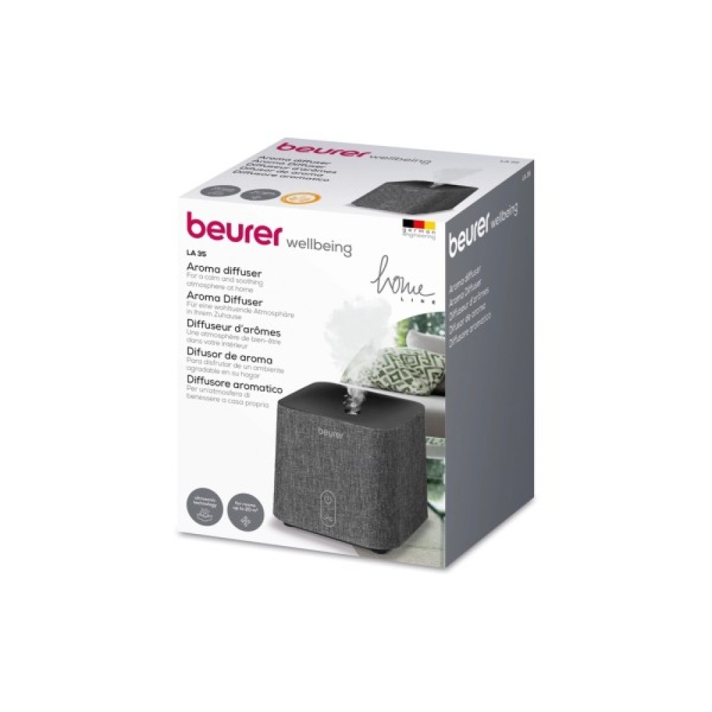 Ультразвуковий освіжувач повітря Beurer LA 35 відрізняється стильним дизайном з благородним тканинним оздобленням та створює затишну атмосферу в будинку. За допомогою водорозчинних ефірних олій він ароматизує приміщення площею до 20 м2, практично не шумить і споживає мало енергії.